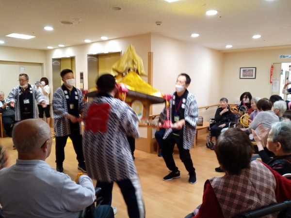 焼きそばが出来上がった頃、エレベーターホールにてご利用者様と恒例のお神輿を鑑賞しました♪ホイッスルが鳴り響き、お祭りムードも最高潮になりました!