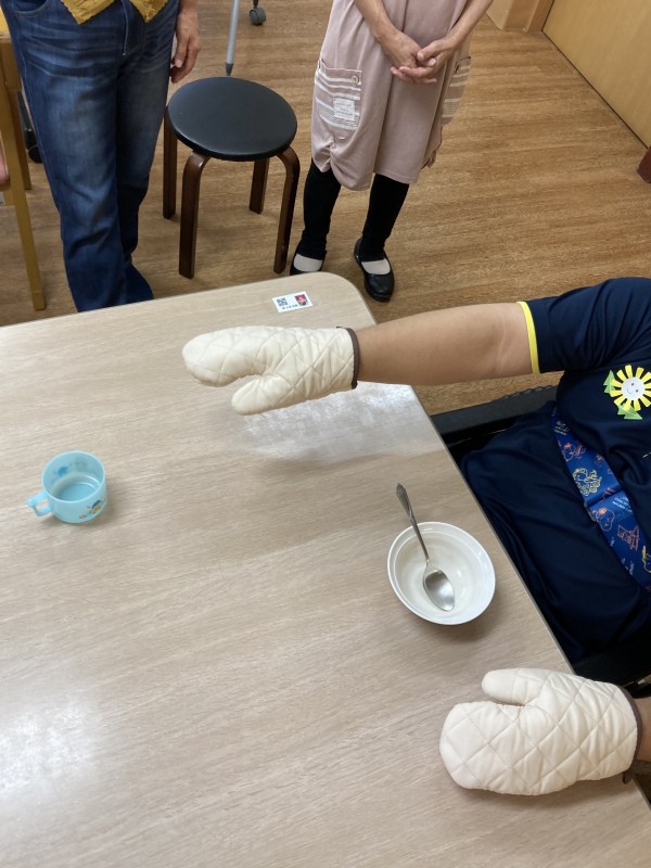車椅子にベルトで拘束し車椅子とテーブルの距離を近くする(間が無いくらいにくっつける)ミトンをして食事をする体験です。