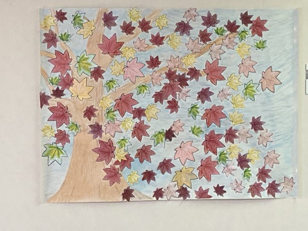 先日3階のクリスマスの飾りつけの様子をお伝えしましたが、今回2階は紅葉の貼り絵を完成させたようです。