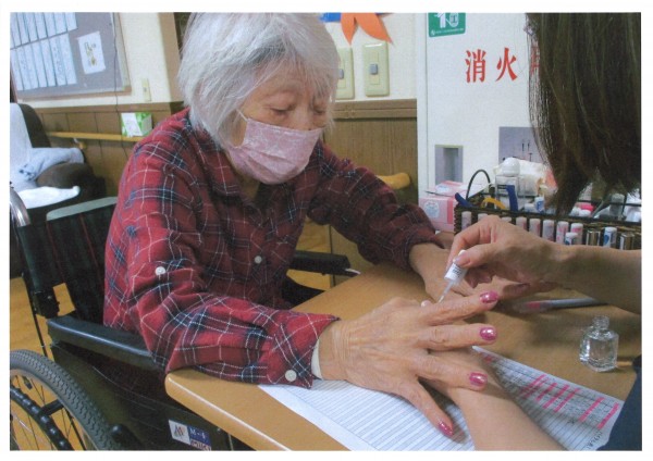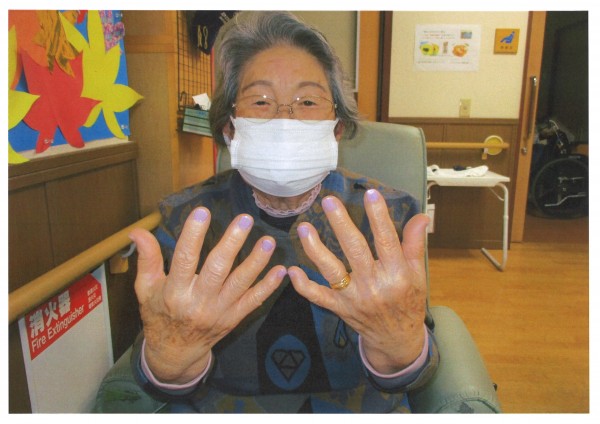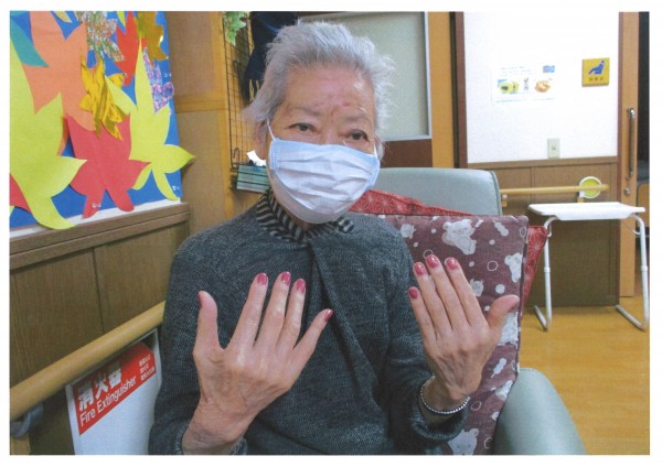 本日は【ネイルケア】の日です。機能訓練や入浴の合間を縫って皆様の爪をお手入れし、お好きなマニキュアを塗ります。たくさんのお色から選ぶのはワクワクしますね。すぐに決まる方、悩まれる方人それぞれですが楽しくお話ししながら色を決めていきます。今回は濃い色味が人気でした。皆様爪の形がとてもおきれいで大変お似合いでした。