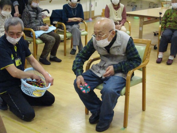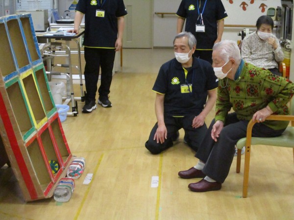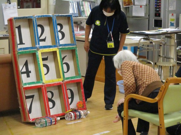 今日の運動レクレーションは『ストラックアウト』です。1~9の数字が描かれたボックスを斜めに設置し、