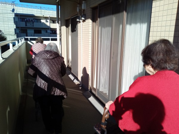 師走に入り、本格的に寒くなってまいりました!グループホームみんなの家・西東京はとても日当たりが良いので、日中は暖かいのが特長です♪天気の良い午後の日、皆様をベランダの散歩にお連れしました。厚着しないと寒いのではと危惧していましたが、窓を開けて歩いてみたらとても暖かかく散歩日和でした♪ベランダを一周して、ベンチに腰掛けて休憩したのですが日差しが強く「まぶしいねー」と皆様話されてました。気分転換の後はジュースを召し上がりました♪