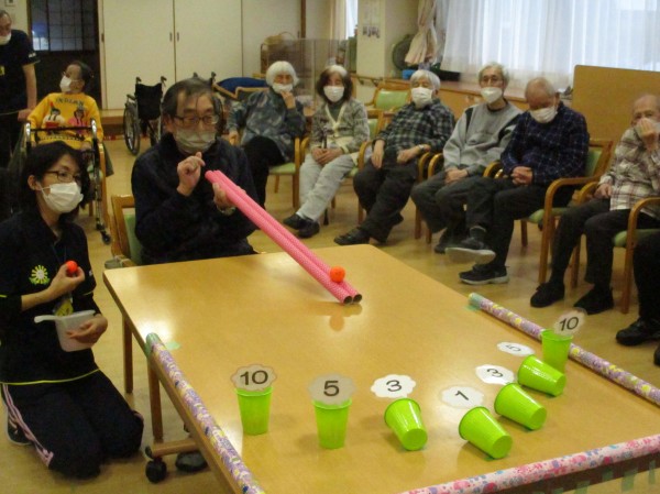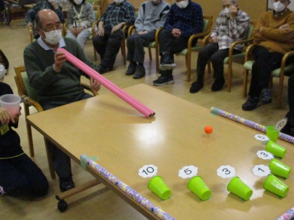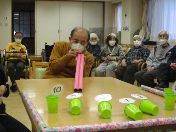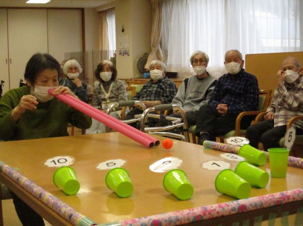 新しく開発しましたレクレーションですが皆さん慣れてこられました。2本の筒の間からミニボールを転がせて数字を付けて寝かせている