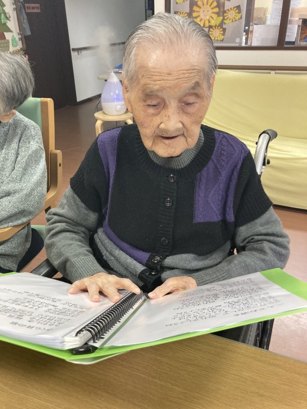 今日は、ご利用者様と歌詞を見ながら歌を歌いました。