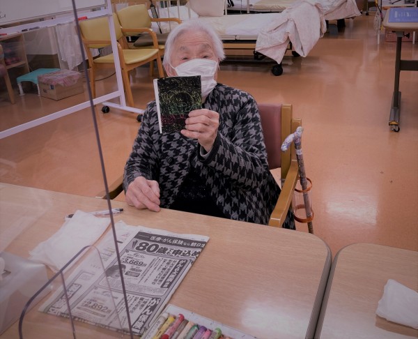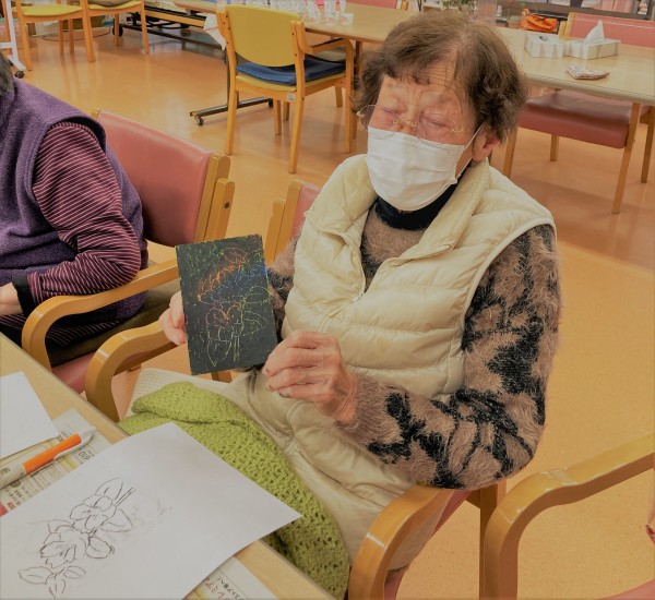 ハガキ裏にクレヨンを塗って、そこから黒で全部染めて最後にボールペンでなぞれば完成です!!