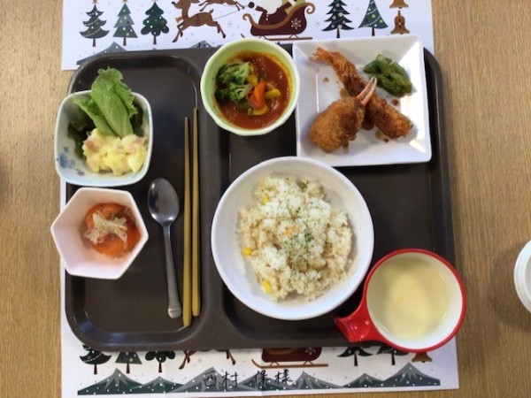 クリスマスのメニューは、『チキントマト煮、カニの爪フライ、エビフライ、炊き込みピラフ、カルパッチョ、ポテトサラダ、コーンスープ、デザート』です。