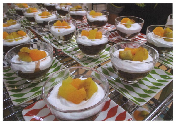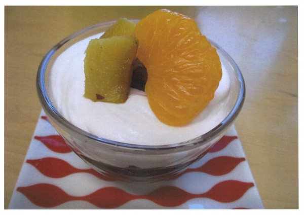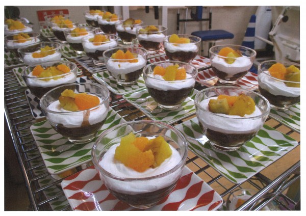 今回のおやつは説明が難しいのですが、白玉ぜんざいからインスピレーションを受けたとのこと。小豆餡のソースにマシュマロをいれ、その上にふわっふわのホイップクリームをON!トッピングはねっとりと甘いサツマイモにみかんが添えてあります。お味は・・・極上です✨