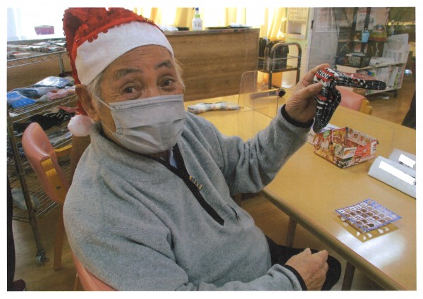 ビンゴで楽しんだ後はこれまた恒例のクリスマスケーキ。大きなケーキでまたまた盛り上がりました。職員も盛り上がりすぎたのでしょうか?肝心のケーキのお写真が・・・ございません????