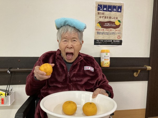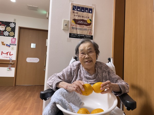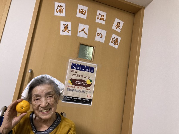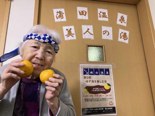 今年も冬至にはゆず湯で温まっていただきました。ゆずの香りっていいですよね。皆さんクンクン。『あら、ゆず??いい香りね、もう冬至ね~』なんてお話されていました。