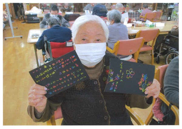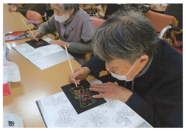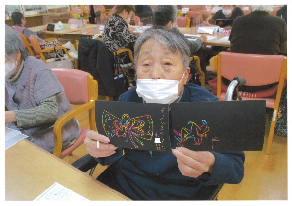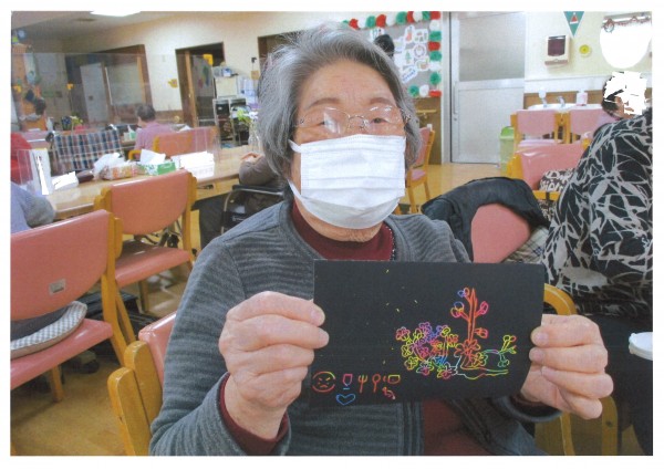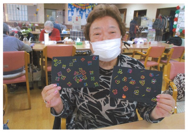 最近の人気のレクは、削り絵でしょうか。黒い紙を木の棒で削ると下からきれいな色が出てきます。他にも将棋や文字合わせ、パズルや国旗当てパズル、塗り絵などに挑戦される方もいらっしゃいます。今日もステキな作品が沢山出来ましたね♪