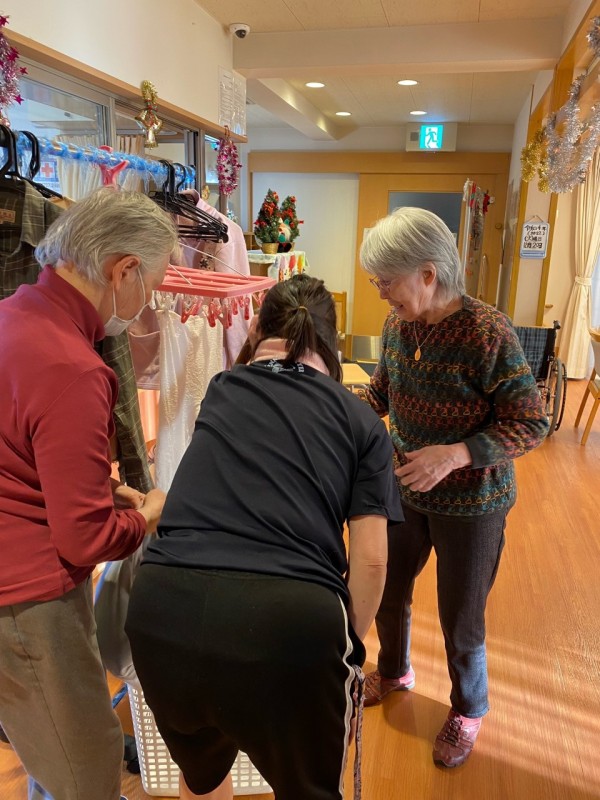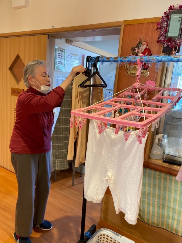 毎朝、おやつの後に洗濯物干しのお手伝いをして頂いてます。