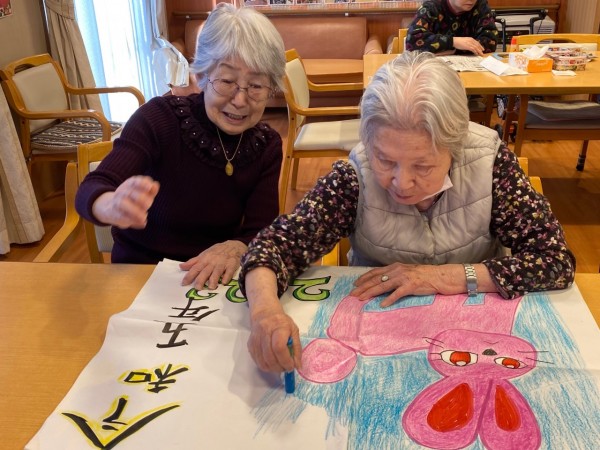ホールに飾る干支の飾りを作成し、塗り絵をしました(^^♪