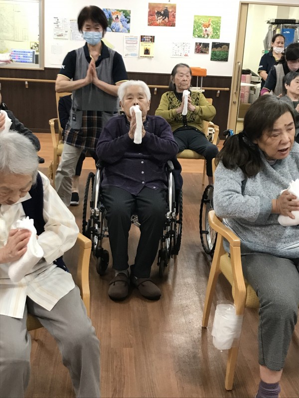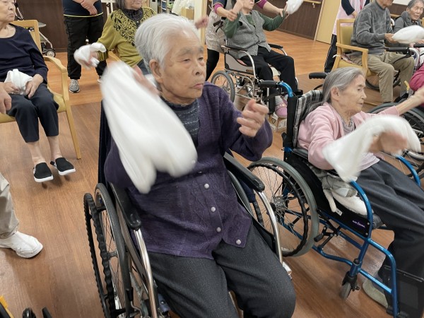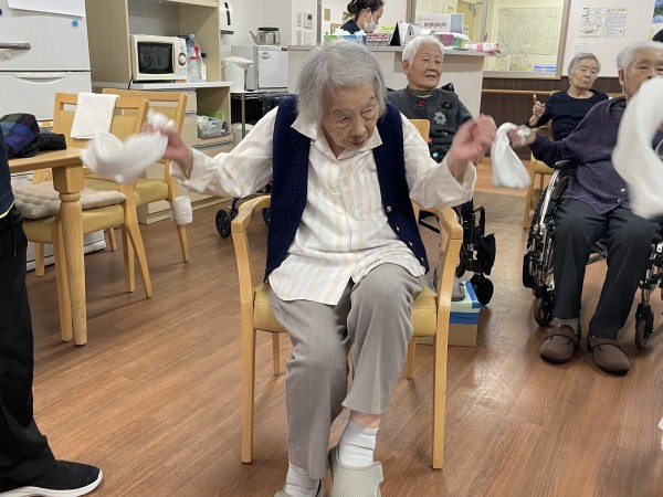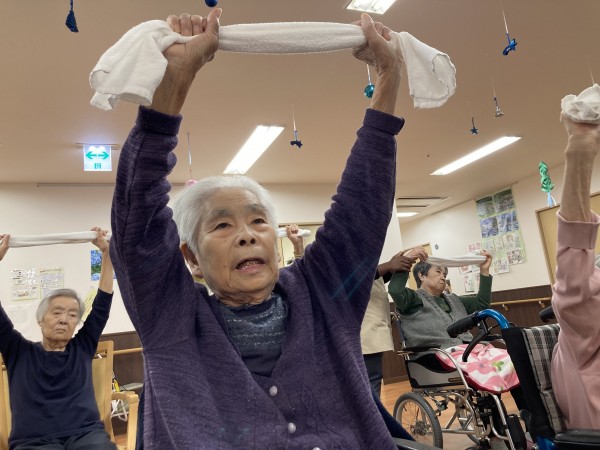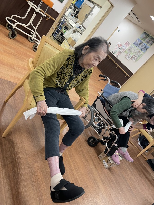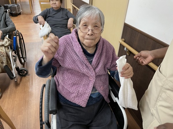 タオルを片手に持って縄跳びを飛ぶ動作を