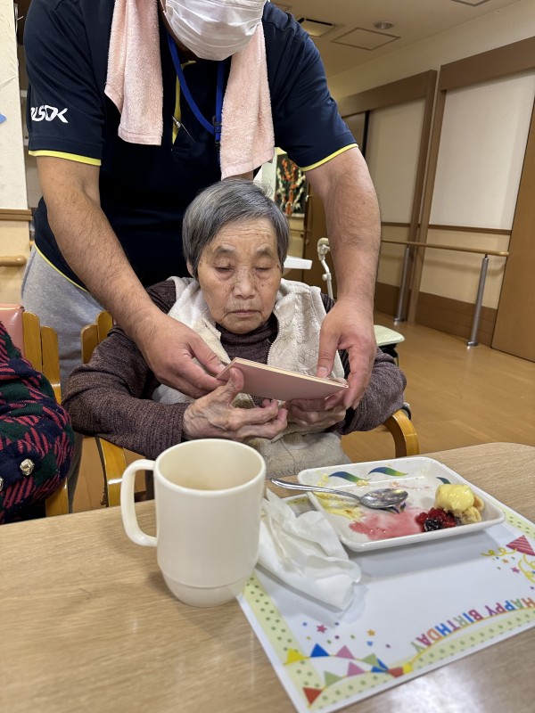 そして、いよいよ本番の折には女性職員の方の心のこもったメッセージカードをお渡しし長寿をお祝いしました。