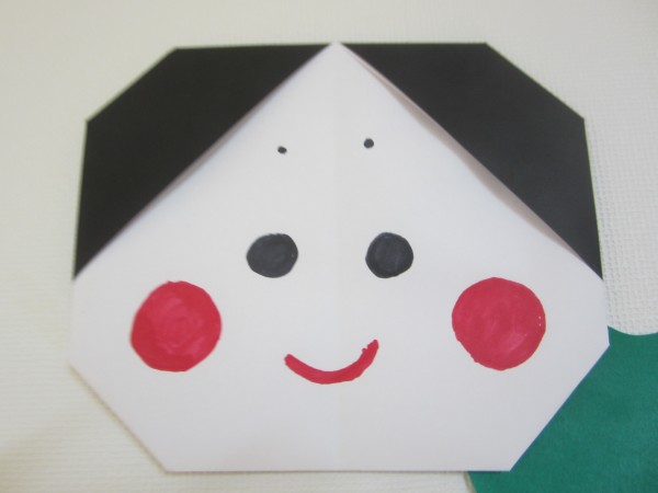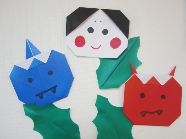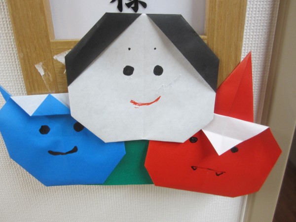 さまざまな色の折り紙で鬼と福を作成しました\(^o^)