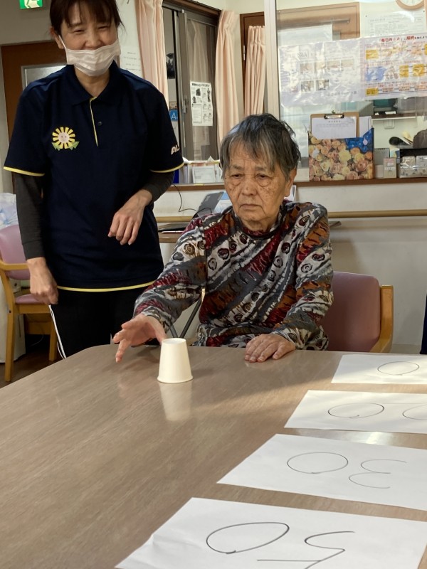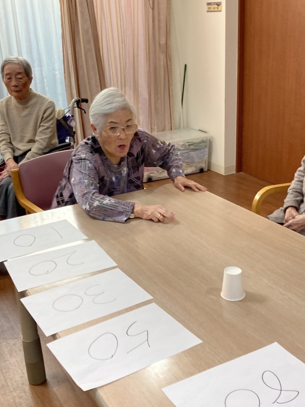 今日のレクリエーションは、職員が考えた、紙コップに作った「テーブルカーリング」