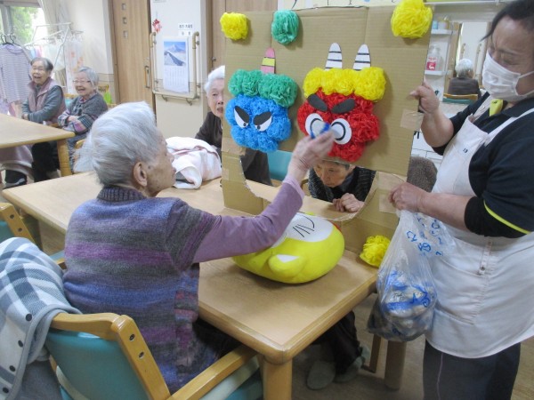 鬼の顔と口をめがけて紙の玉を投げていただきました。