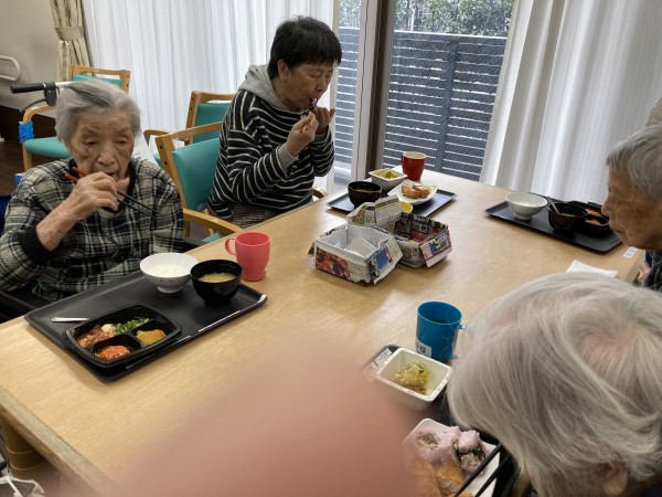 後ろに写っている歯科衛生士さんが週に一度食事の状態観察をしてくれます。この日は節分。メニューは節分寿司・イワシの煮つけ・彩り紅あずま・味噌汁でした。安全に召し上がっていただくために、細かくカットして提供もしています。