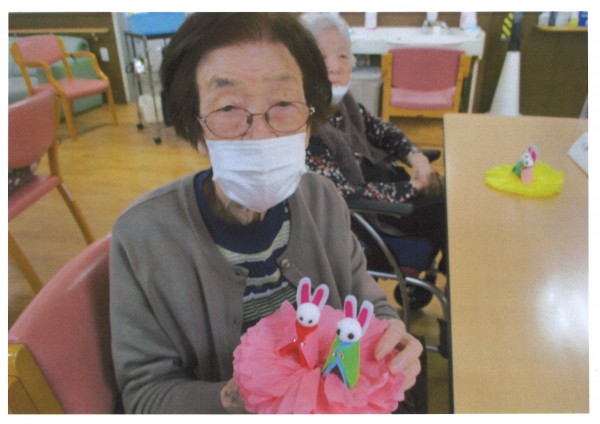 本日の午後のレクリエーションは【お雛様飾り作り】昨日に引き続き、雛飾りを作ります。かわいいうさぎちゃんのお雛様、作りながら、皆様かわいさにメロメロでした。完成した、お雛様を見るやさしい眼差しが印象的でした。