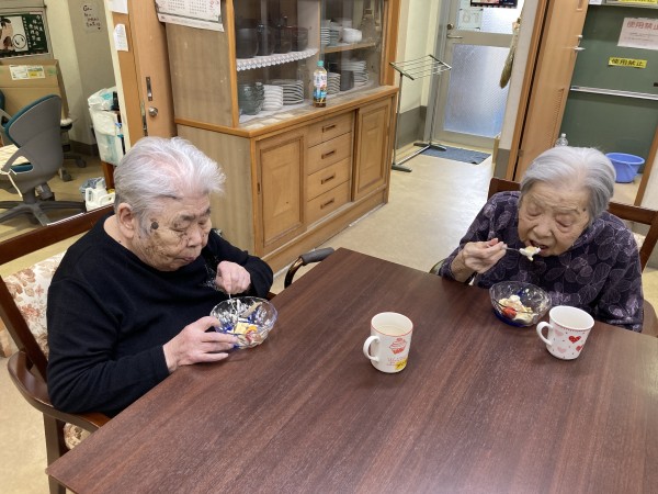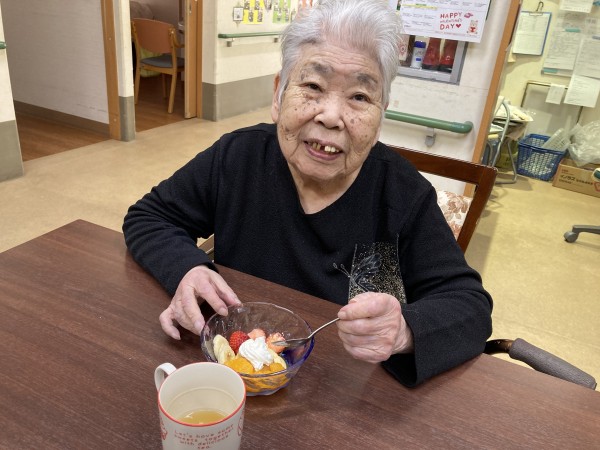 豆まきの後、スタッフ手作りのプリンアラモードと青森産りんご100%のりんごジュースをお召し上がりになりました