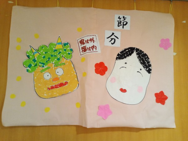 2月3日は節分でしたね♪ホームの近隣の保育園「きたしば保育園」より、園児手作りの作品を頂きました。事務所の受付に掲示させて頂きました♪かわいい鬼と犬に癒やされますね!イベントの度に温かみのある作品を頂き、感謝感激です。