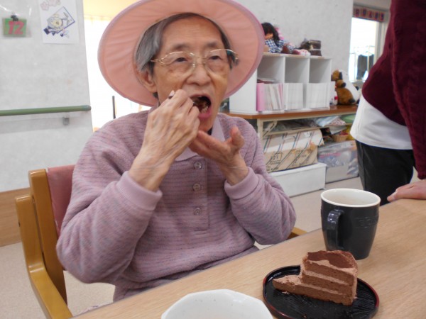 チョコレートケーキをお出しし、「甘くて美味しいわね~」「ペロッと食べれちゃう」と美味しそうに召し上がっております。