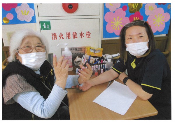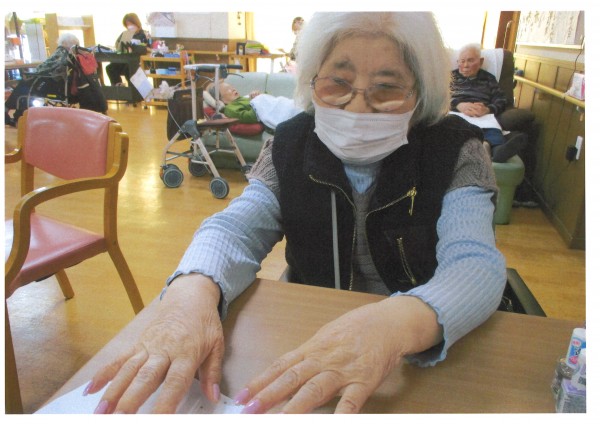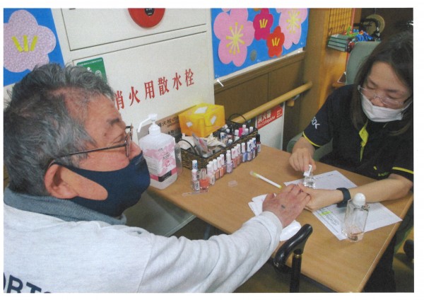本日は【ネイルケアの日】爪を整え、お好きな色のネイルを爪にのせていきます。たくさんの色を揃えていますので、お話ししながら色を選ぶのも楽しみのひとつですね。女性はもちろんですが、男性にも人気があります。ピンクをご希望される方もいらっしゃいます。指先にちょっと色やツヤが入るだ気持ちがウキウキしますね。