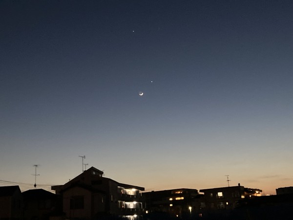 本日の日の入り後に三日月が金星と木星に接近する珍しい天体ショーが見られました。