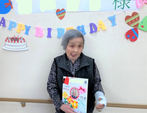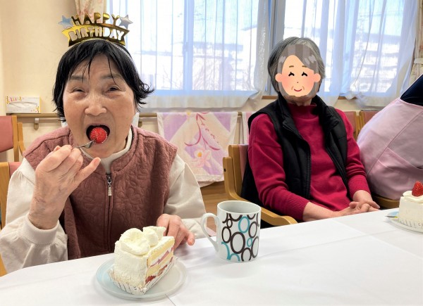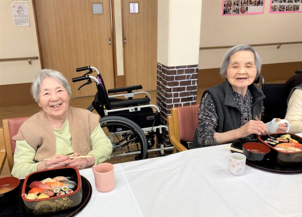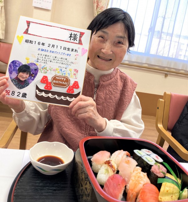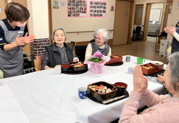 お昼ご飯のお寿司を食べ終わった後、お誕生日会当日にシニアセラピーさんが♪