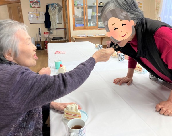 ケーキを食べていると、H様が「私生クリームだけ食べたい!」とおっしゃり、前のお席のK様に、主役のイチゴを「あーーーん」笑