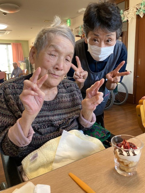 今回はお誕生日の方がいらっしゃらないので「生苺パフェ」を喜んでいるご利用者様の笑顔をご覧ください♪
