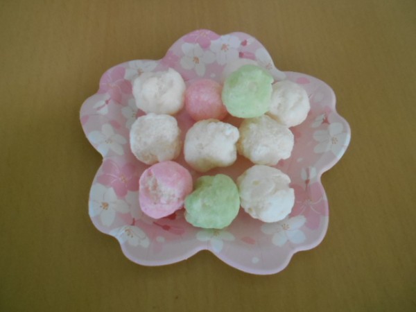 カラフルな大きな雛あられにキョトンとされる方、「わっ、大きい!!」とびっくりされる方。
