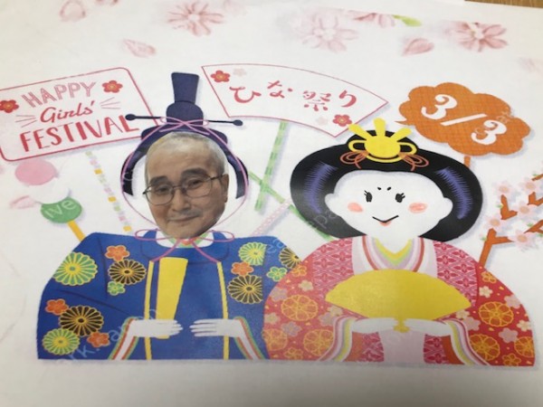 事前にスタッフで用意したご利用者様の写真入り男雛と女雛をランチョンマットに、甘酒とひなあられをプレゼントしました。