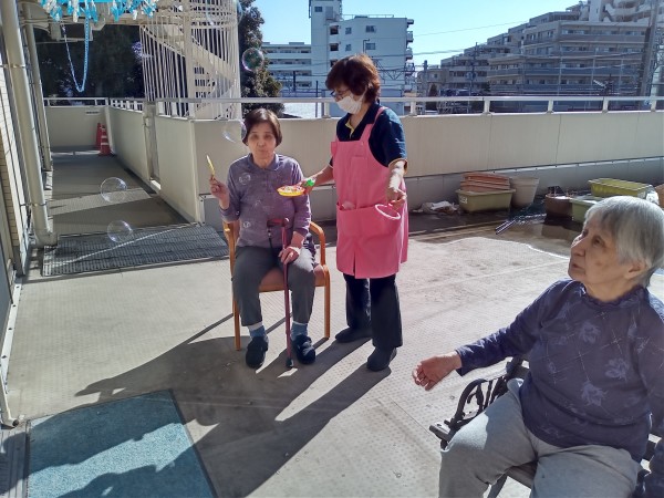 先日、午前のティータイムの後にベランダにてシャボン玉を飛ばしました♪吹くタイプではなく、穴の空いた小さなラケットのようなものを使いました!大きいシャボン玉や一度にたくさんの玉がつくれる形です♪意外と慣れないと使いこなすのが難しく、華麗な手さばきで何度も挑戦される方も居て、きれいな形が作れた時には歓声が上がりましたね♪日光浴も兼ねて、楽しんで頂けたようです♪