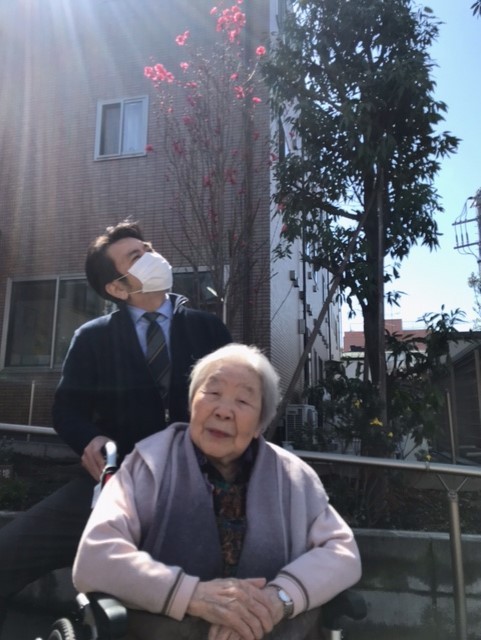 施設の庭に桃の花が咲きましたので日向ぼっこをしました。