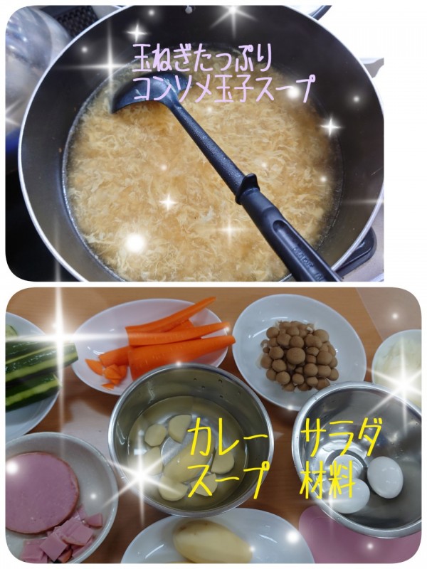 職員もおっそわけ頂き♡とても美味しく挽き肉カレー☆マカロニサラダ☆玉葱たっぷり玉子コンソメスープ♡が出来上がりました(^^♪ 大成功です♡