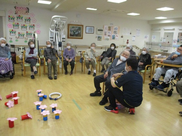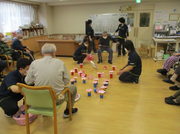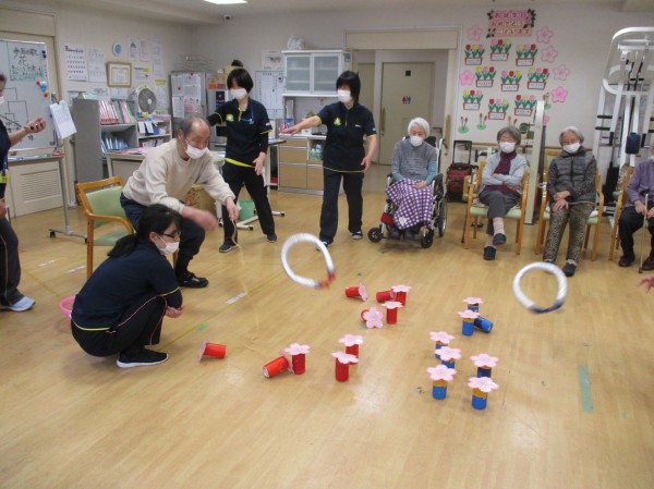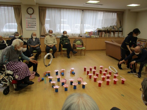 今日の運動レクレーションは『きのこ狩り』です・・・キノコに見立てた造作物に紐の付いた輪っかを投げ