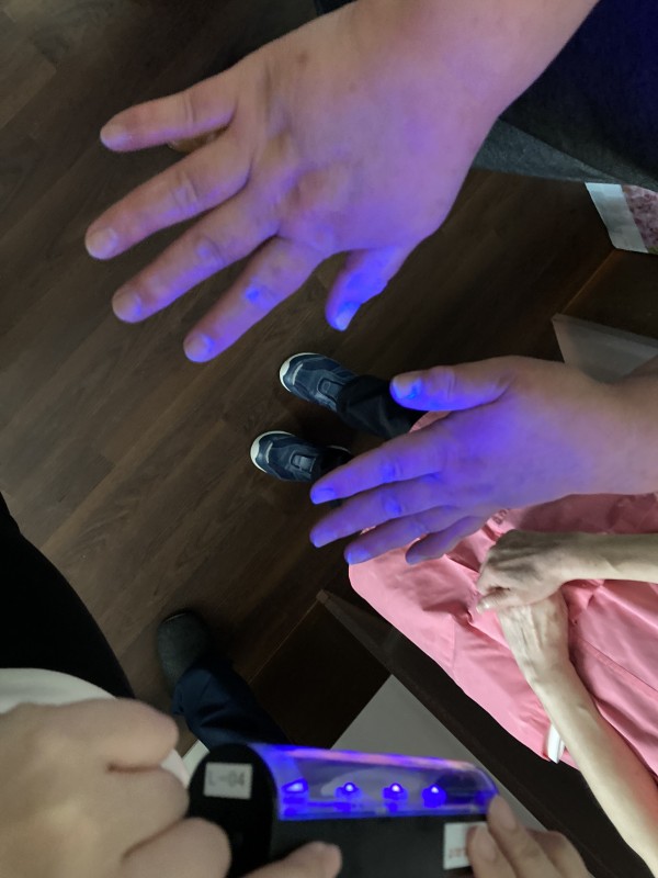 ブラックライトをあてて、洗い残しが無いかの確認です。きちんと洗ったつもりでも、やはり爪の間に汚れが残っている事が分かります。手首も忘れがちなようです。「爪の汚れは爪ブラシで落とさないとかな?」と話していると、講師の方から「今は爪ブラシでかえって傷をつけてしまう場合があるので、推奨はしていないんです。。」との事でした。爪を掌にこすり付け丁寧に洗うのが良いそうです。『そーなんですね』と頷くスタッフ一同。勉強になりました。