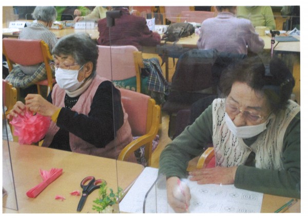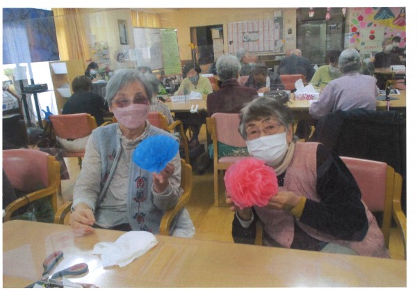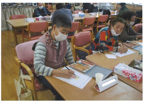 午後のレクリエーションでは、4月の塗り絵と飾りを作っていただきました。皆様思い思いの色で塗り絵を楽しんでいらっしゃいました。