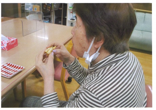 本日は皆様お待ちかね【センター長の手作りおやつ】です。あま~いキャラメルソースをトーストしたマフィンでサンドしたおやつです。みかんも入っていて甘さの中に爽やかなみかんが香ります。今日も大好評でした。おかわりないの?と皆様からありがたいお言葉を頂戴しました♪