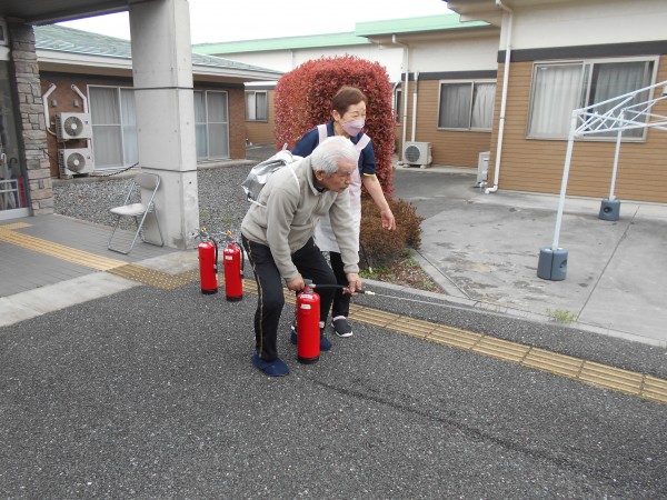 職員が消防署へ訓練の連絡を行い、入居者様たちといざという時の為に消火器の使い方を確認しました。