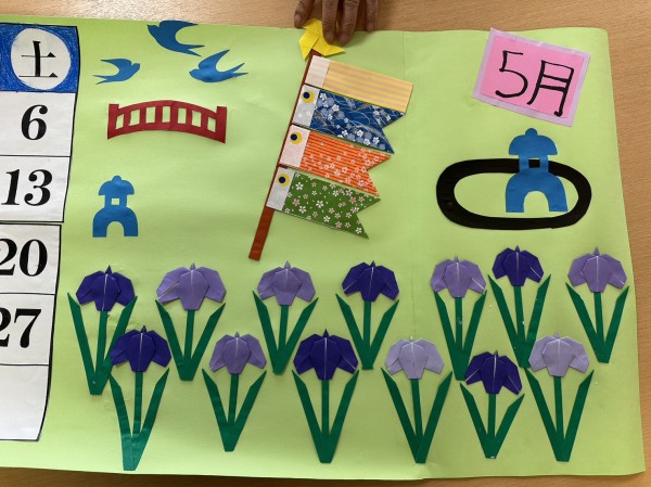 スタッフと一緒に、折り紙で菖蒲と鯉のぼりを作りました☆