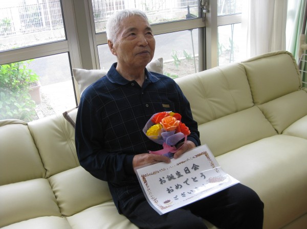 4月 1階1名の方のお誕生日をお祝いしました。85歳です。【おめでとうございます! 元気でお過ごしください!!】 は~い、よろしくお願いいたします。と話されました。お誕生日の歌を歌いお祝いをして写真を撮りました(^^♪ 嬉しそうに笑顔一杯でした( ^ω^)・・・