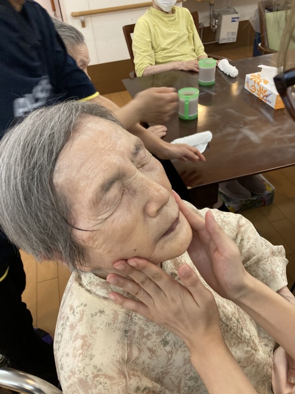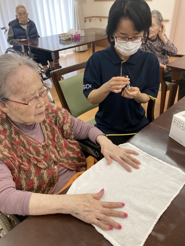 美容レクの内容は、希望者に①手浴・マッサージ→ネイルと②温タオルで顔を温め血行を促進→美容パックを行いました( *´艸`)♡