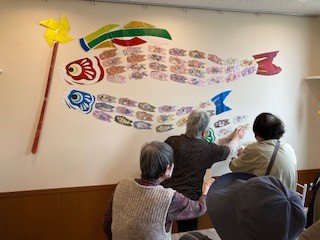 前週の四季彩おりがみ教室で制作頂いた小さめの鯉のぼりをうろこに見立て、大きな鯉のぼりがせせらぎの壁に舞い上がりました。