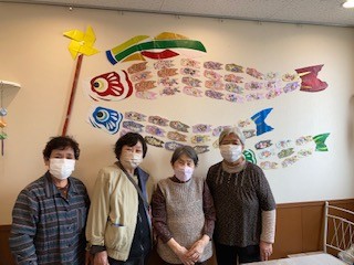 4月24日(月)、ラジオ体操後に4名のボランティアの方にご協力頂き、壁面に飾つけをしました。