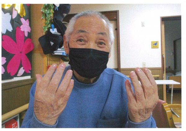 本日は【ネイルケア】の日。爪の形を整え、お好きなカラーを選んで頂きます。マニキュアが初めての方、久しぶりの方、とても楽しみにされているようで、お色選びの時から会話が弾みます。爪に色や艶が入ると、手がきれいに見えるから不思議ですね。今日も皆様からの笑顔のご褒美、たくさん頂きました♪