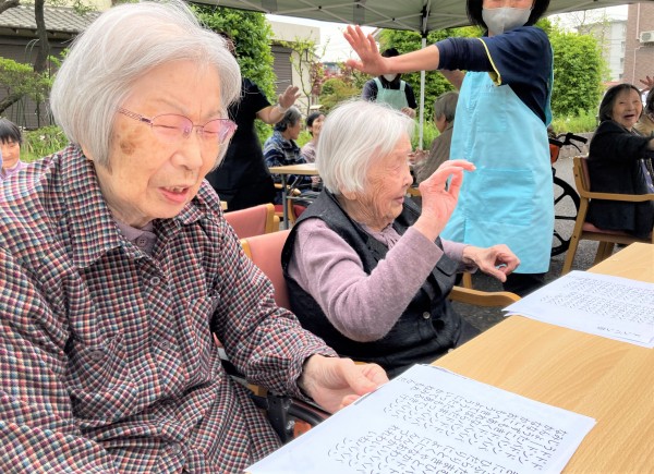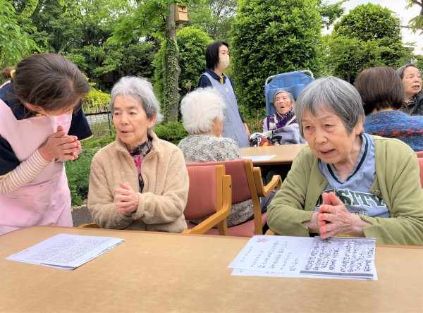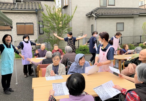 少し肌寒いですが、皆様にお集まりいただきましたので、おやつの前に歌と体操を行います(^^)♪