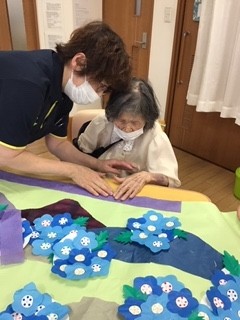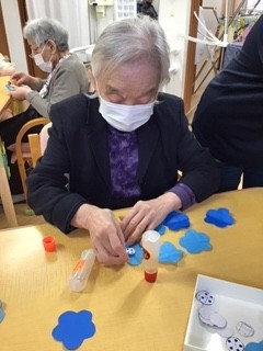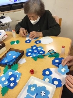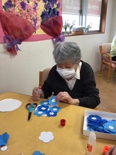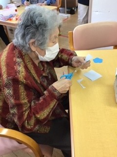 ブルーの折紙をお花型に切って、、、、