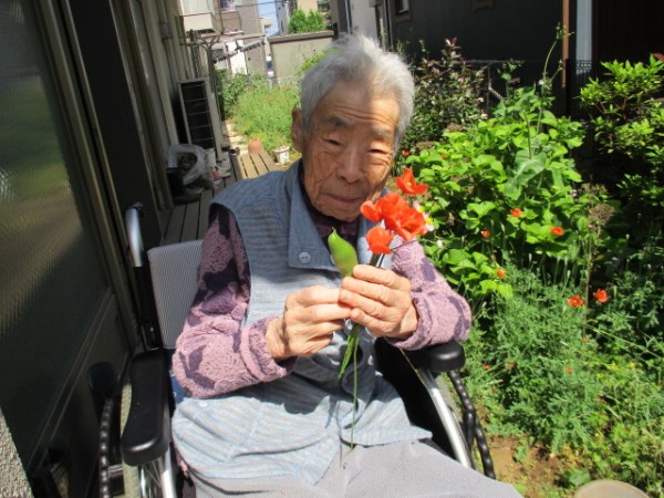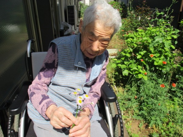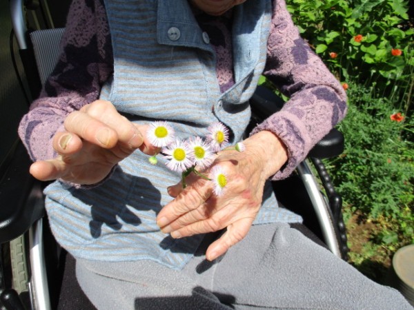 暖かい昼下がりF様ウッドデッキで、お花をみて